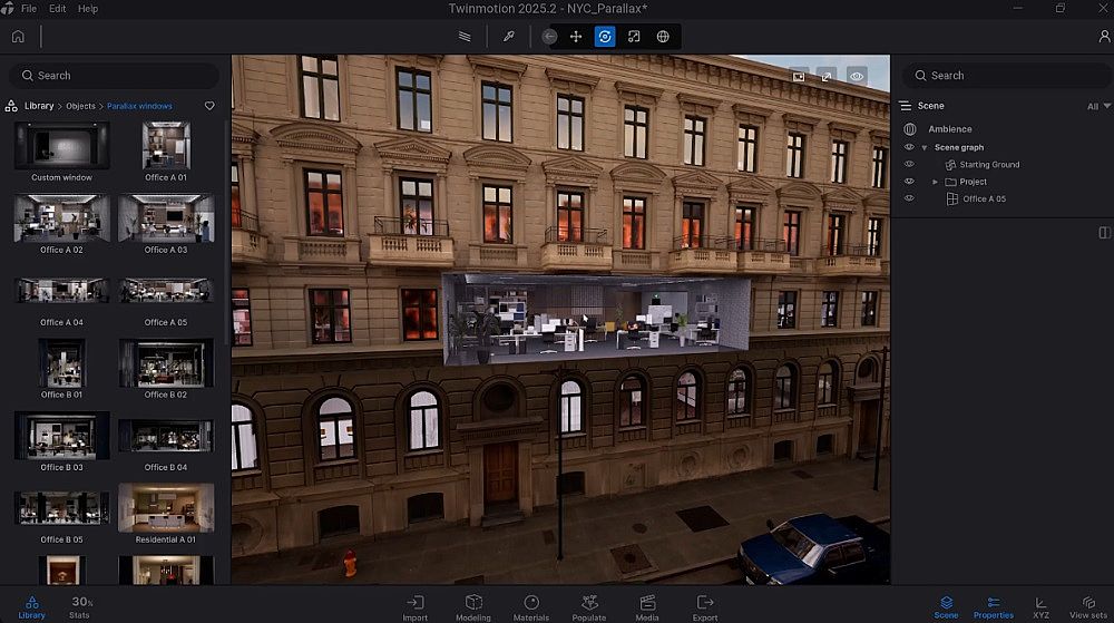 Twinmotion 2025.2 新增的 視差窗口 (Parallax Window),通過特殊著色器技術,在無需復雜幾何體的情況下即可營造出逼真的室內空間縱深感。