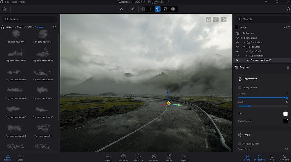 同時,新增的 17種動畫霧效卡片 讓用戶只需拖放即可為場景添加氤氳霧氣。霧效響應風向與風速變化,性能開銷極低,是快速塑造氛圍的理想工具。