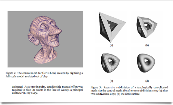 托尼•德瑞斯對CG動畫制作界最為重要的貢獻,就是引入了高還原度的曲線/曲面的生成算法:如何將復(fù)雜的形狀分解成電腦可以生成的多邊形。多年以來,電腦動畫和電子游戲制作都在致力于用多邊形來表示一個真實世界的三維物體。但是,使用多邊形的問題就在于,仔細一看,還是看得出來多邊形的棱角的。CG業(yè)界的趨勢是用“平滑”曲面代替多邊形,這些“平滑”曲面會經(jīng)過原來多邊形頂點所在的位置。數(shù)學(xué)家針對此方,發(fā)明了各種快速生成“經(jīng)過固定點的‘平滑’曲面”的方法。